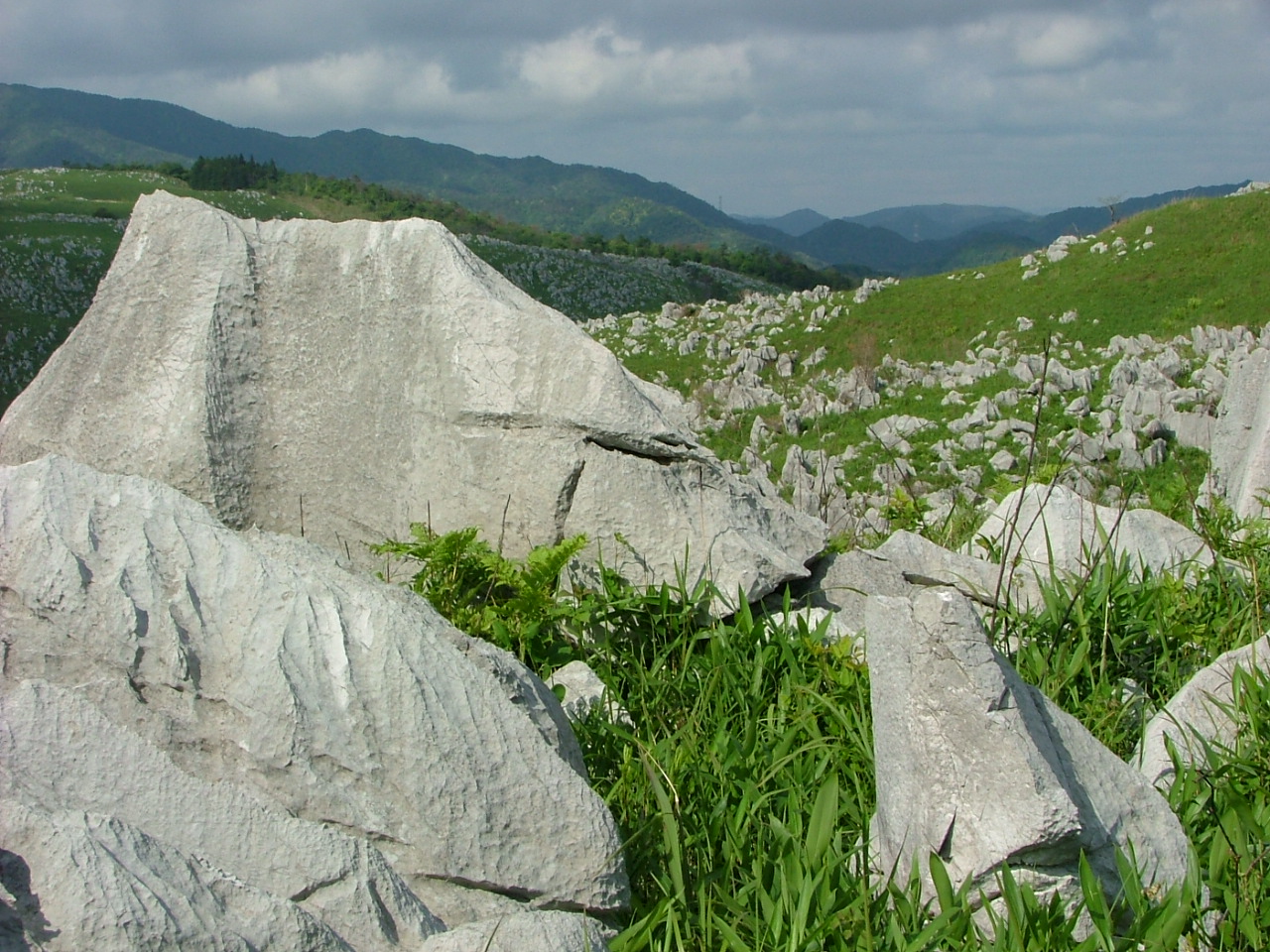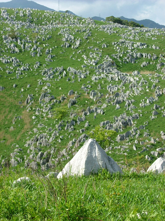 秋吉台の長者ヶ森駐車場から遊歩道を地獄台に向かってしばらく歩くと石灰岩の集団に出会います。
