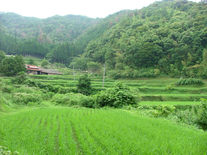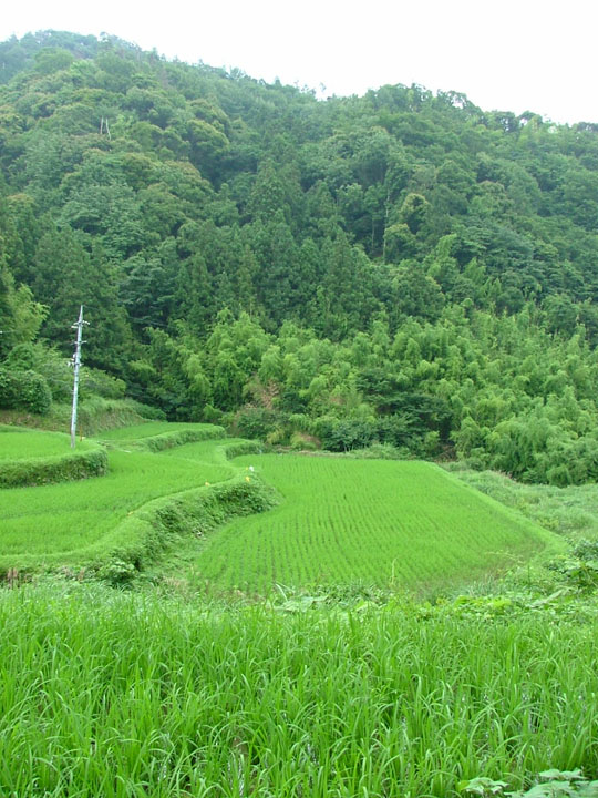 民家もまばらで、美しい棚田が緑眩く眼下に広がっている。