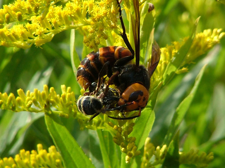勝利したスズメバチは倒した蜂をぶら下げて飛び去って行きました。