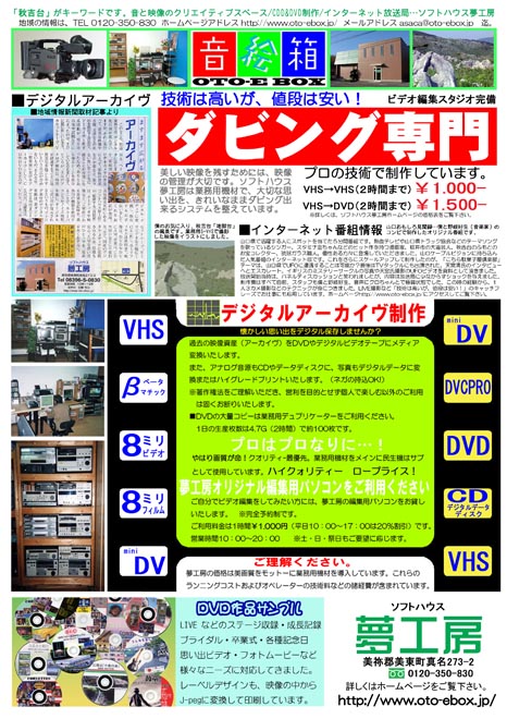 グーグルやヤフーでDVD制作で検索しても、秋吉台のふもと、いなか者の僕のHPなどははるか後方の深層部に格納されているので、全く新規のお客さんはとれないのが現状だ!