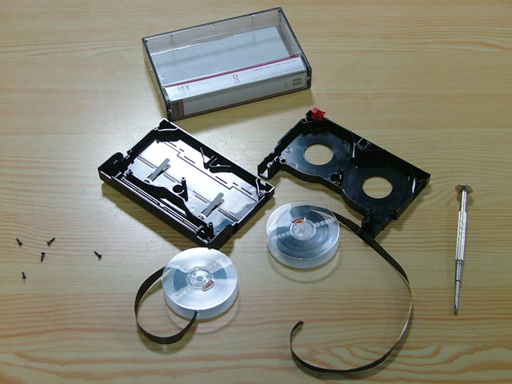 ビデオテープの整理をしようと、8ミリムービーにカセットテープを入れたのだが、ここ数年使用していなかったためメカに巻き込んだまま動かなくなったらしい。
